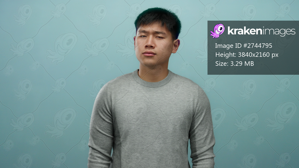 Young man wearing gray sweater stands against an isolated blue background, capturing a simple and contemplative expression.
