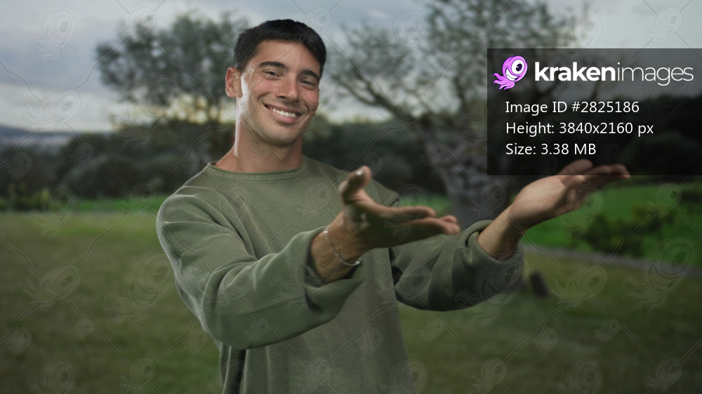 Young man wearing green sweater pressing hand on chest with smile in park; gratitude respect sincerity calm.