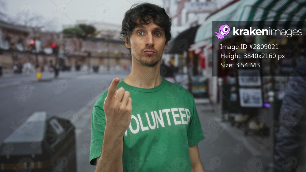 Young man wearing green volunteer shirt beckons with open hand on city street outside souvenir stand; invitation.