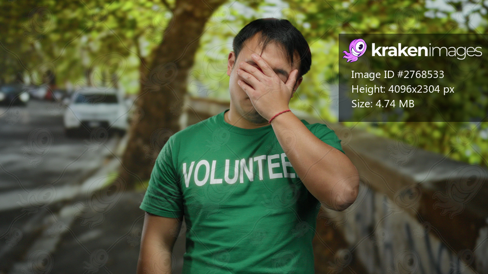 Young man wearing green volunteer shirt standing on urban street, looking thoughtful with hand on face, surrounded by trees and cars in the background. - Kraken Images