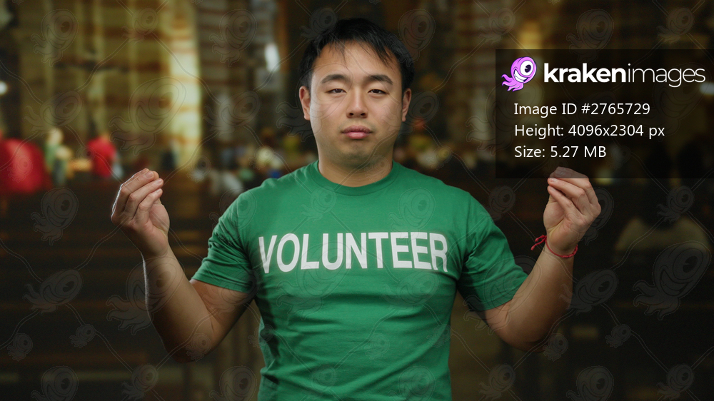 Young man wearing green volunteer shirt stands confidently in a church setting with a blurred background suggesting an indoor gathering.