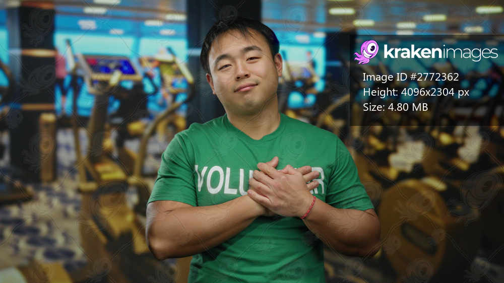 Young man wearing green volunteer shirt stands confidently in modern gym with exercise equipment in the background, embodying strength and community spirit. - Kraken Images