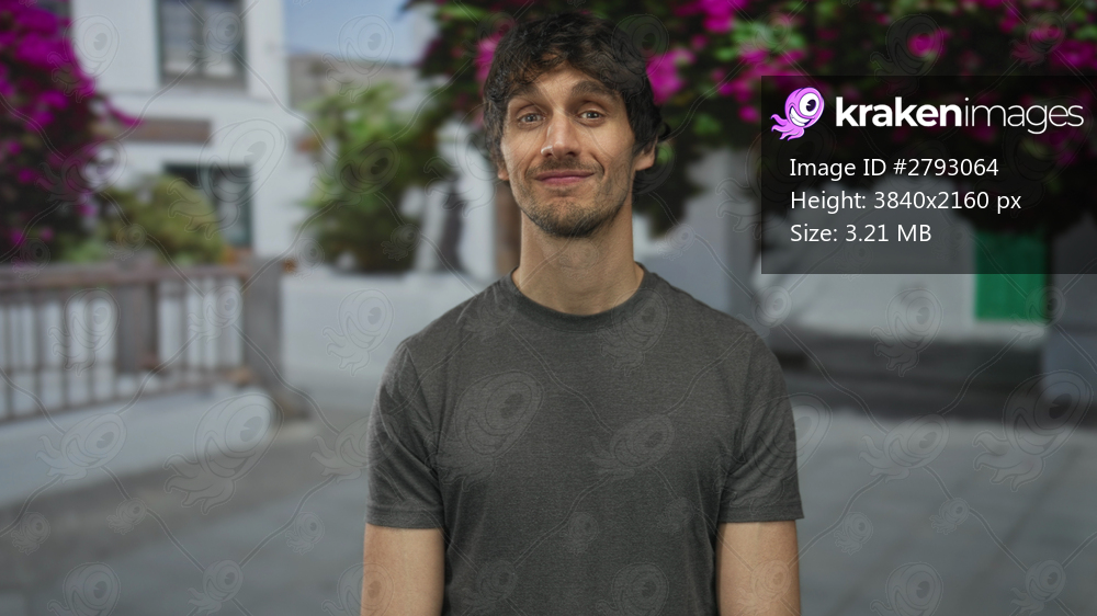 Young man wearing grey tshirt smiling on paved city street under vibrant bougainvillea trees near a white building; happiness.