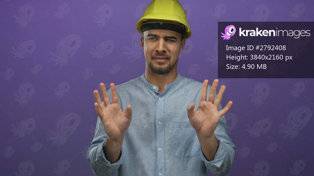 Young man wearing hardhat gestures in refusal against isolated purple background conveying a concept of unease in construction safety environment