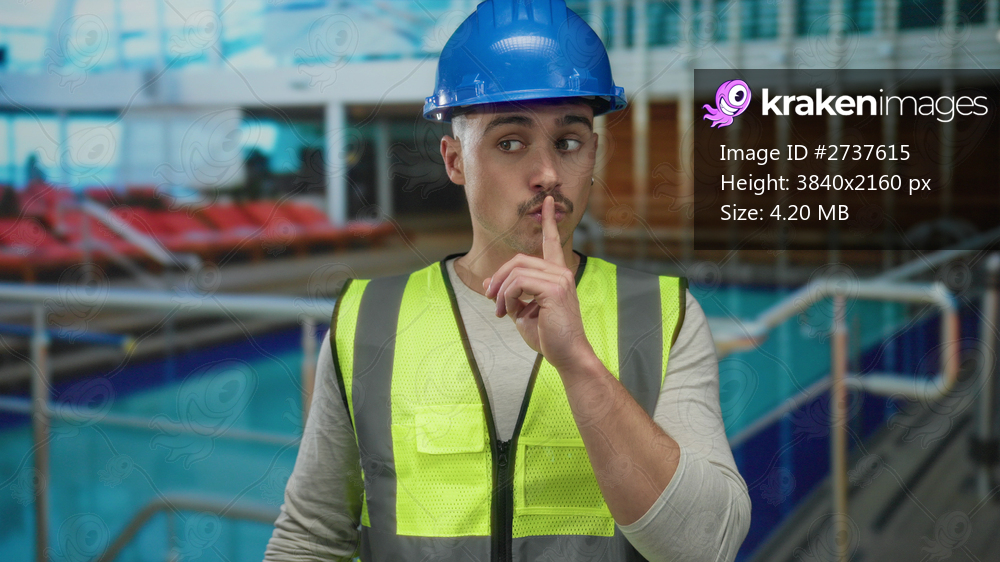 Young man wearing hardhat and reflective vest making shushing gesture on cruise ship surrounded by deck chairs and sea