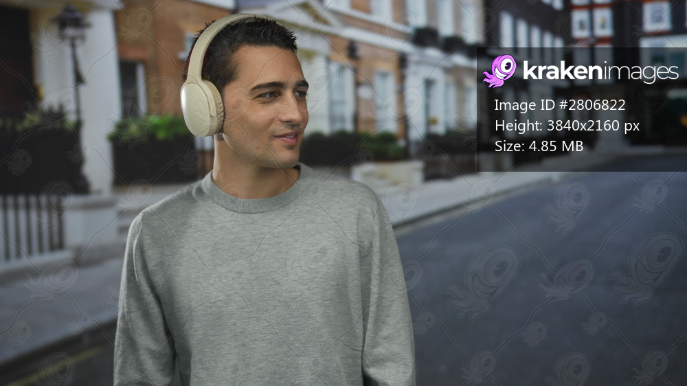Young man wearing headphones enjoying music on an urban street with blurred buildings in the background during daytime in a city setting.