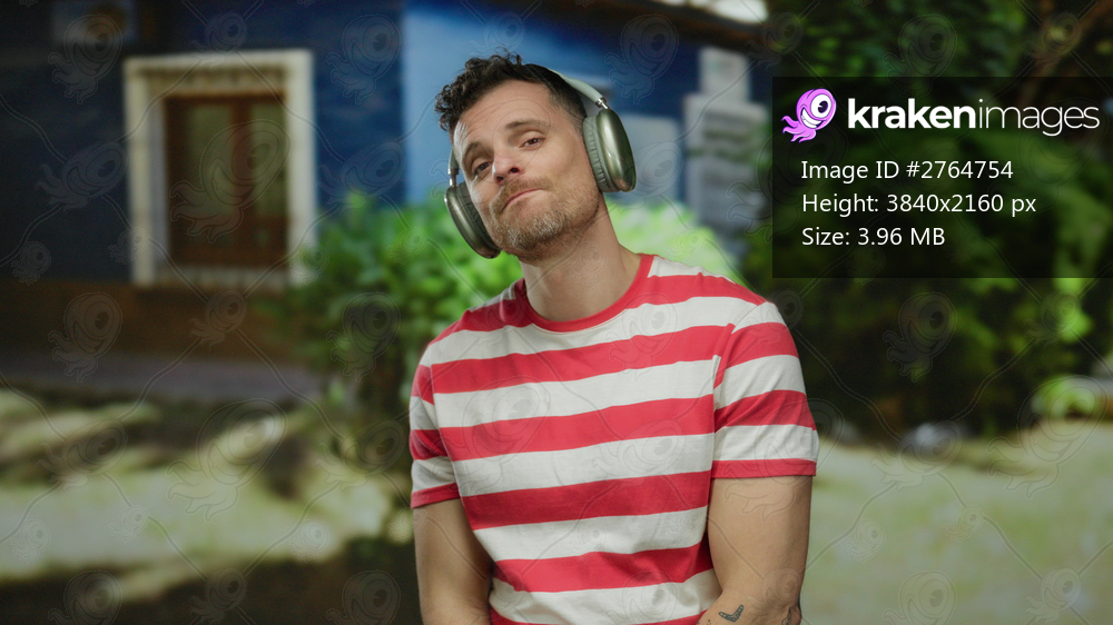 Young man wearing headphones enjoys music outdoors in an urban setting, wearing a striped shirt, surrounded by greenery and buildings.