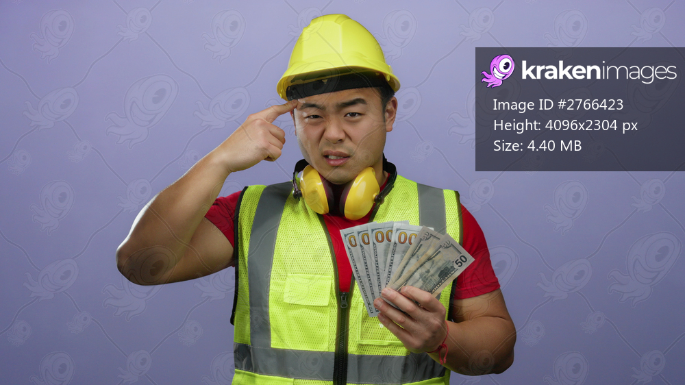 Young man wearing helmet holding us dollars with a thoughtful expression against a purple background.