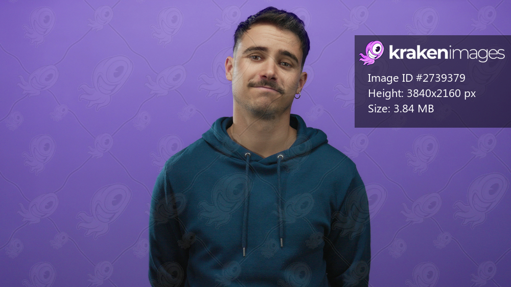Young man wearing hoodie standing against a vibrant purple background with a confident expression, showcasing casual fashion and modern style appeal.