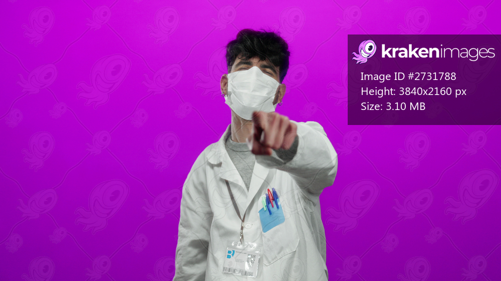 Young man wearing mask and lab coat points directly at camera with a playful expression against isolated pink background, creating an engaging and intriguing portrait setting. - Kraken Images