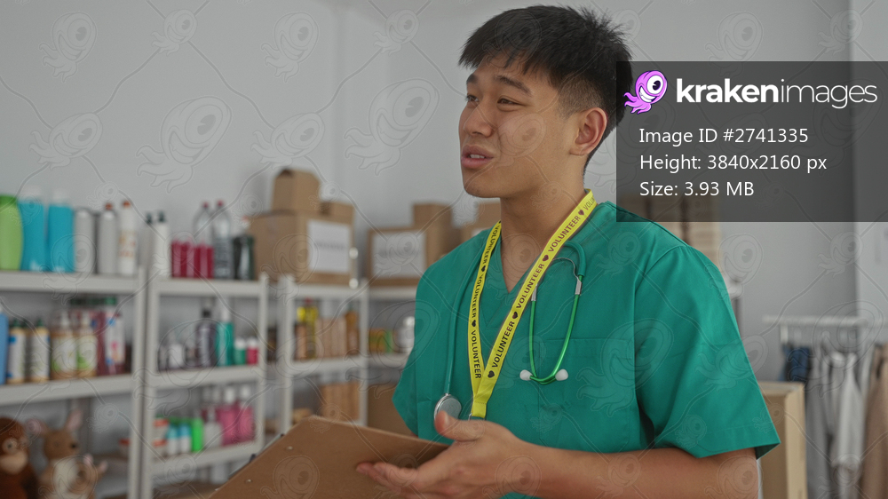 Young man wearing medical scrubs and volunteer badge with clipboard in charity donation center surrounded by boxes and supplies.