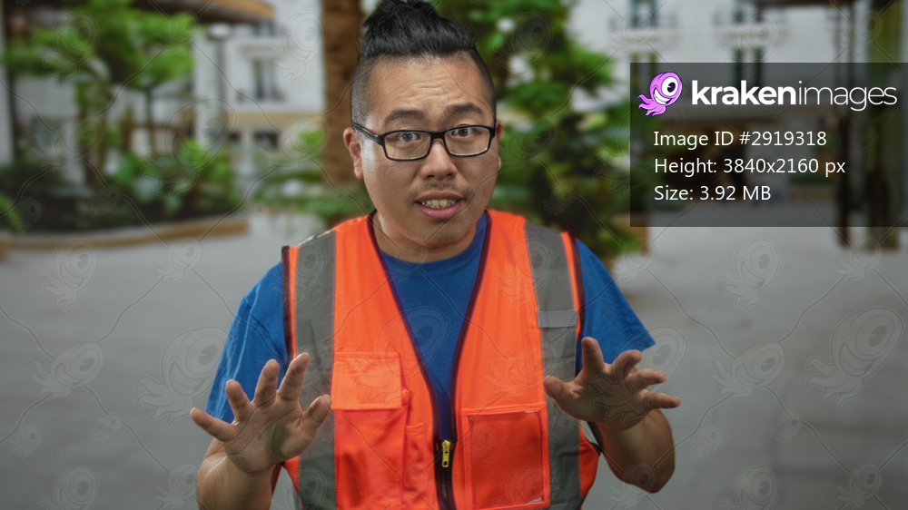 Young man wearing orange reflective vest with palms out on street in front of building storefront, glasses visible; safety caution.