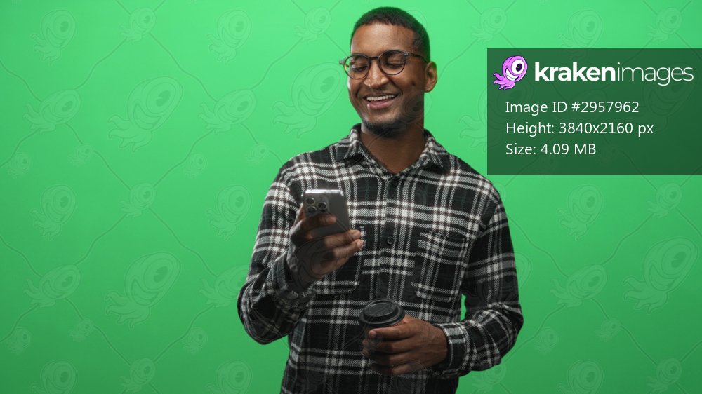 Young man wearing plaid shirt and glasses holding smartphone and coffee cup, smiling while looking at screen in studio; joy connection.