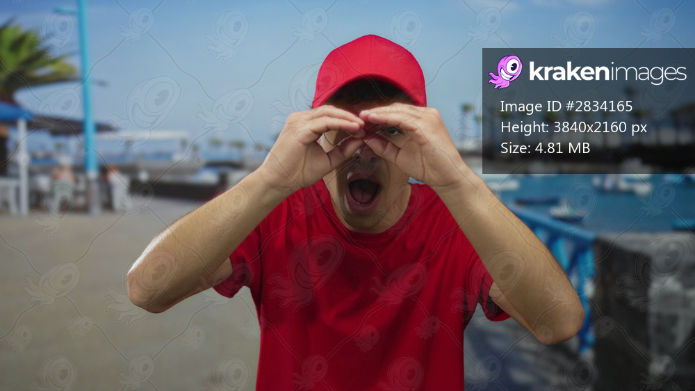 Young man wearing red cap looks through binocular gesture with hands on street; curiosity exploration.