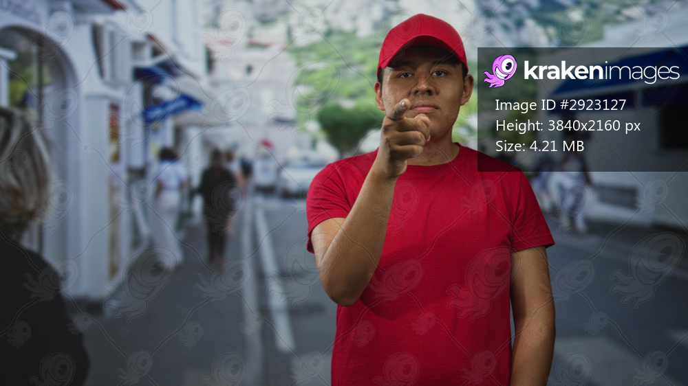 Young man wearing red cap and red shirt pointing finger at camera while standing on a busy street with blurred pedestrians; confidence challenge.