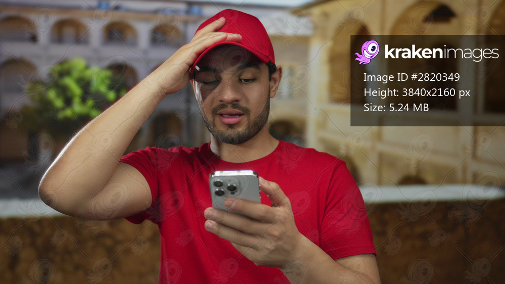 Young man wearing red cap and shirt taps smartphone on sunlit old town street flanked by historic arches; surprise.