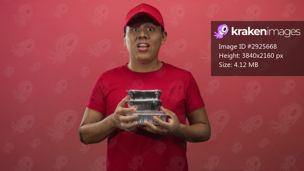 Young man wearing red cap and t shirt holding stacked foil takeout containers and smiling in a red studio; service pride.