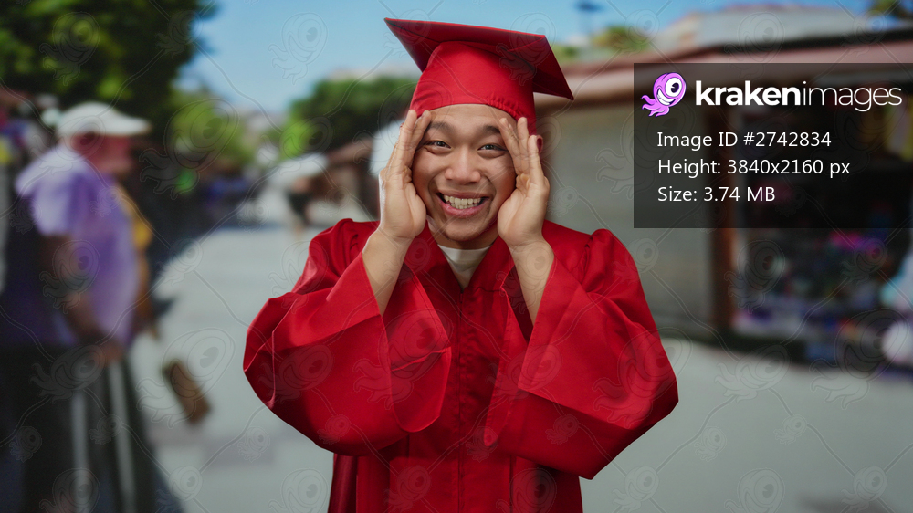 Young man wearing red graduation gown covers face with hands in a lively city street market setting, symbolizing celebration and new beginnings.