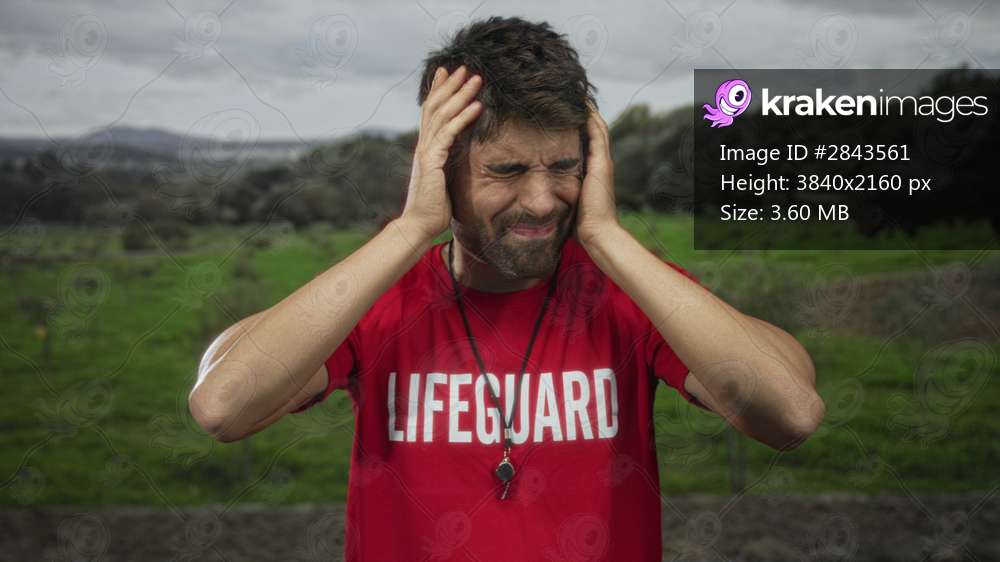 Young man wearing red lifeguard shirt with whistle covers ears with hands in dense forest; distress.