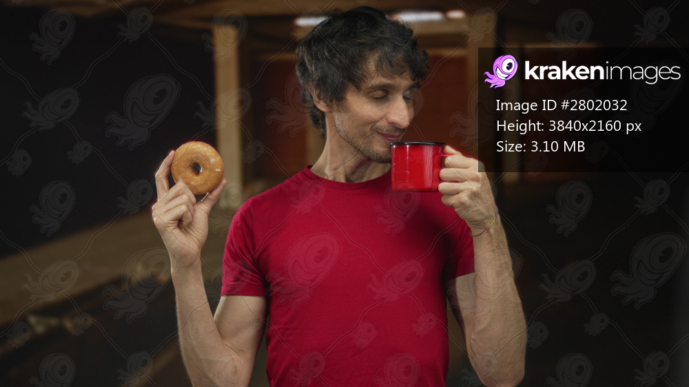Young man wearing red shirt holds glazed donut in left hand and red mug in right hand inside building structure; morning contentment.