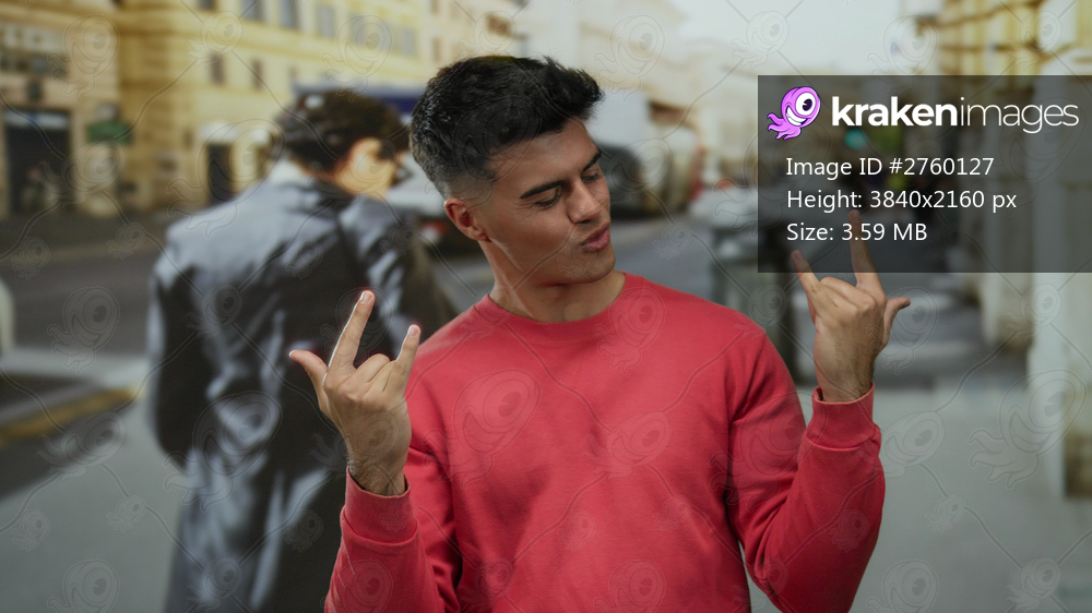 Young man wearing red sweater smiling and gesturing enthusiastically on a bustling city street during daylight.
