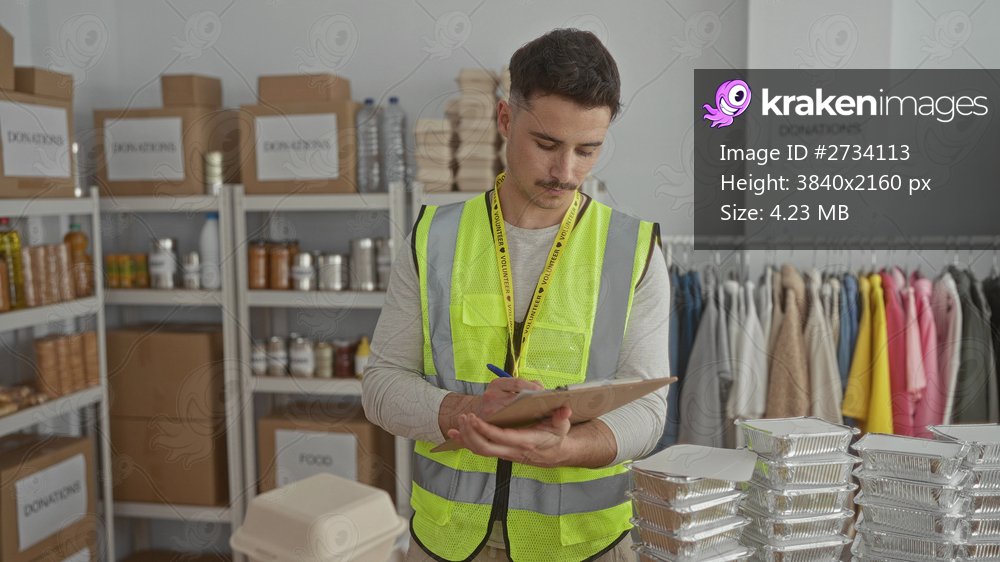 Young man wearing reflective vest volunteers in a charity center surrounded by donation boxes and food packages, checking inventory on a clipboard.