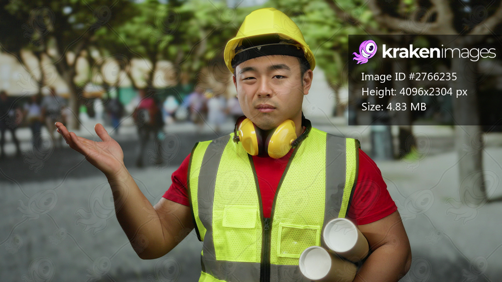 Young man wearing safety gear on urban street holding blueprints offering a friendly gesture, symbolizing architectural planning and construction in an outdoor city environment. - Kraken Images