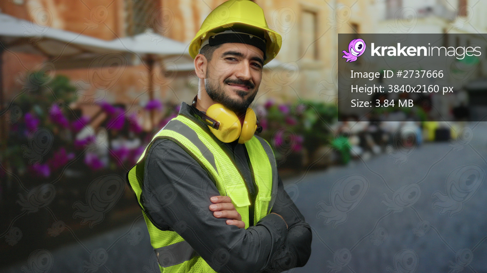 Young man wearing safety gear stands confidently on a terrace at an outdoor restaurant smiling with crossed arms.