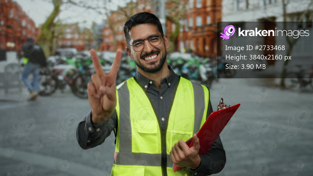 Young man wearing safety vest making peace sign on urban street while holding clipboard with blurred city background.