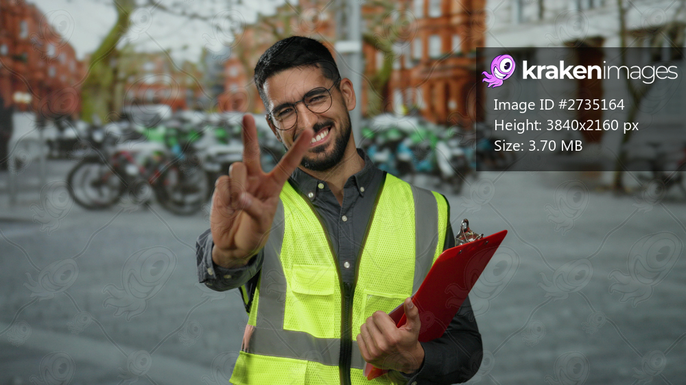 Young man wearing safety vest making peace sign on urban street while holding clipboard with blurred city background.