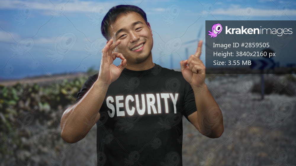 Young man wearing security shirt showing ok gesture on street near windmill tower in open field; approval trust.