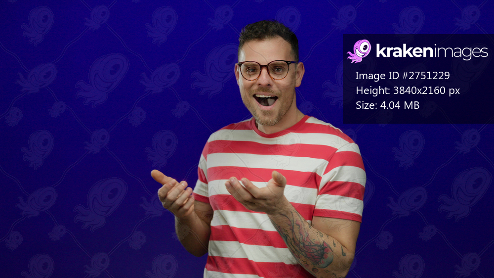 Young man wearing striped shirt and glasses with surprised expression against blue background highlights vibrant contrast and casual style.