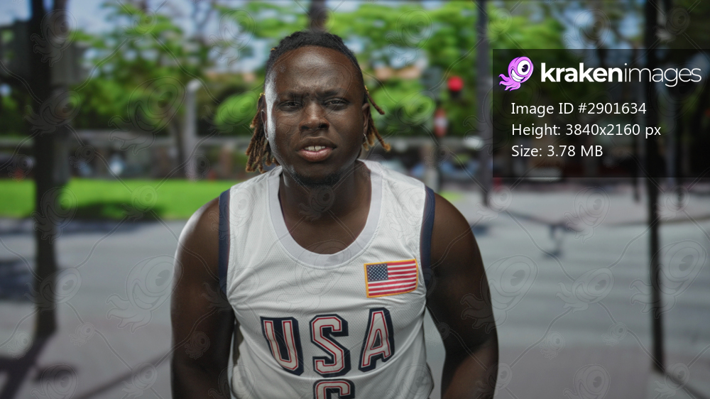 Young man wearing usa jersey squinting toward camera and walking slowly on a sunny city street with trees and traffic light visible; determination pride. - Kraken Images