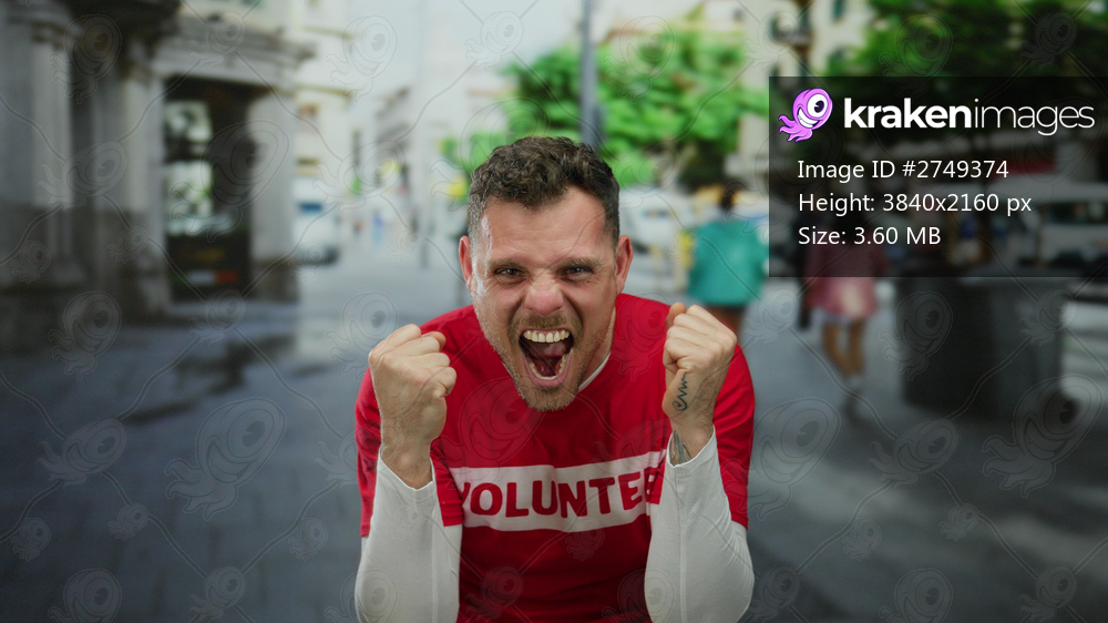 Young man wearing volunteer shirt celebrating success with joy in urban street environment showing emotions of happiness and gratitude.