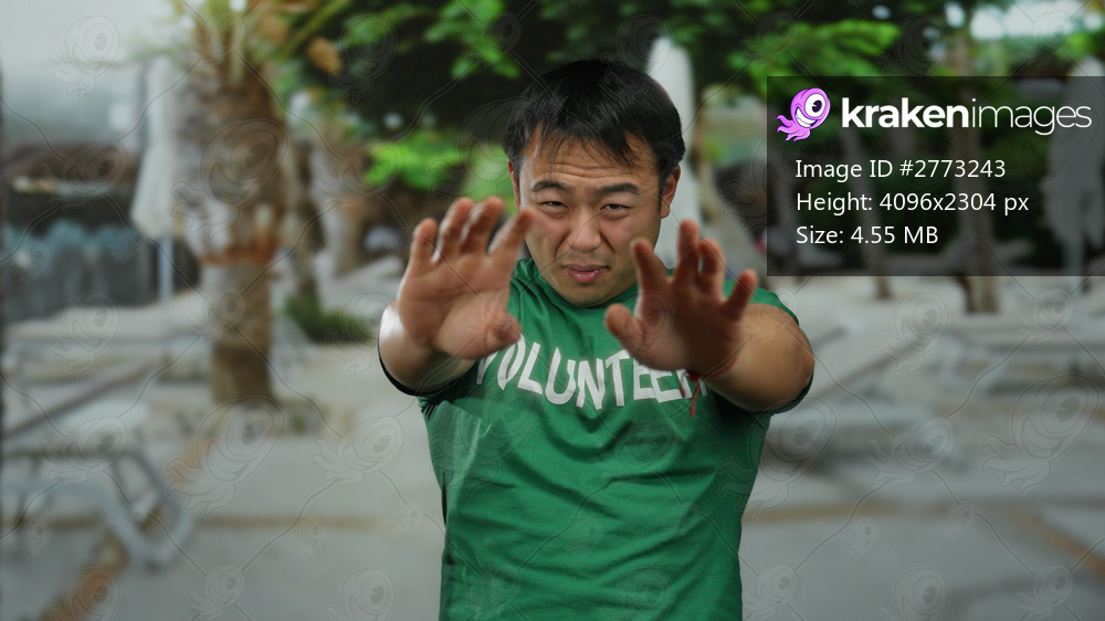 Young man wearing volunteer shirt playfully covers face with hands while standing outdoors on an urban street under lush green trees.