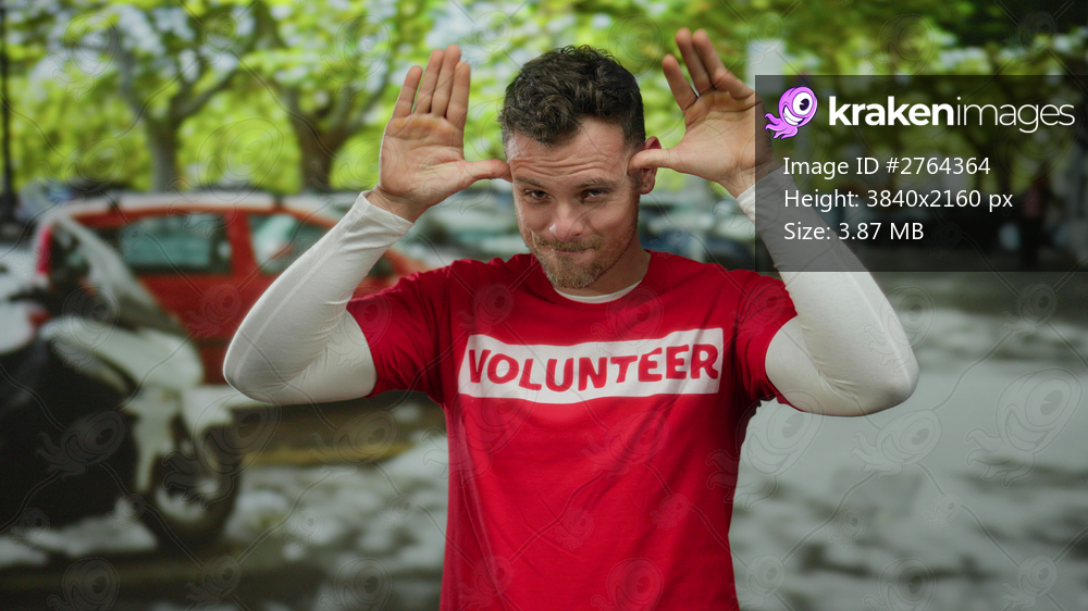 Young man wearing volunteer shirt smiling cheerfully on urban street with trees and cars, embodying a joyful and positive vibe in a vibrant city environment. - Kraken Images
