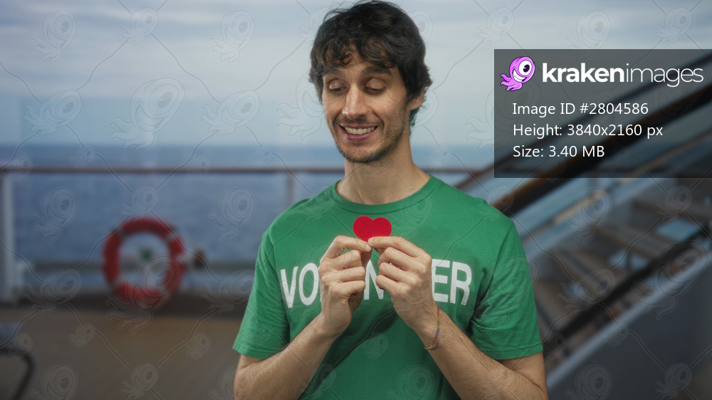Young man wearing volunteer shirt smiling and holding small red heart near chest in building interior; compassion kindness.