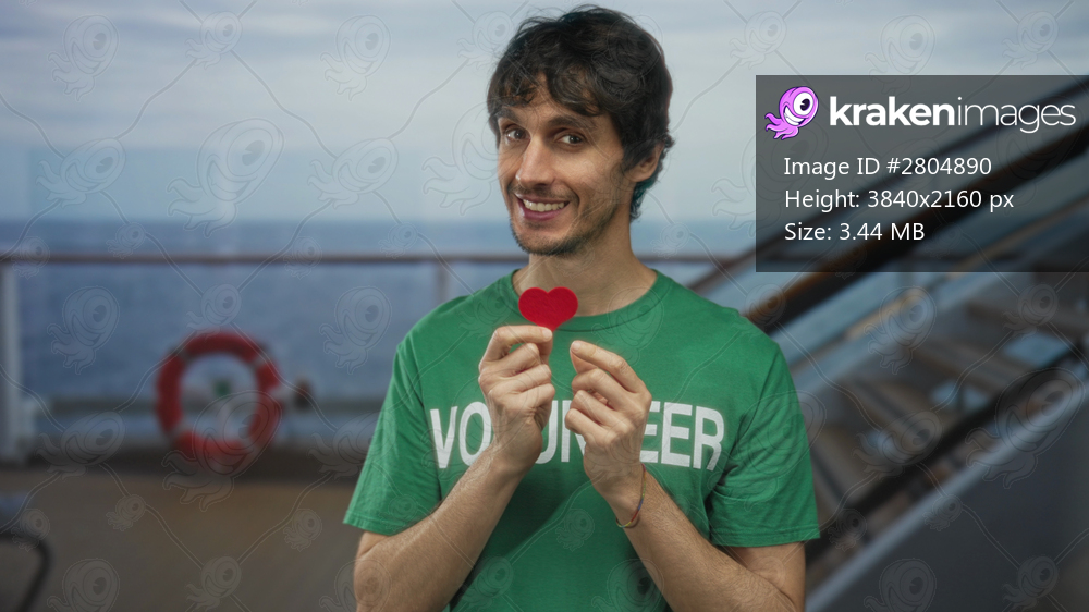 Young man wearing volunteer shirt smiling and holding small red heart near chest in building interior; compassion kindness.