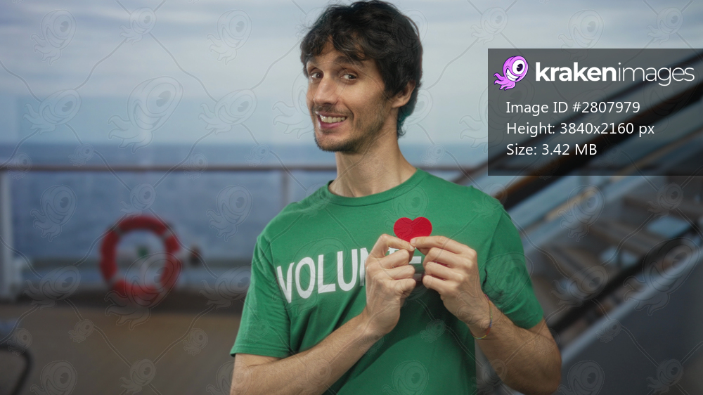 Young man wearing volunteer shirt smiling and holding small red heart near chest in building interior; compassion kindness.