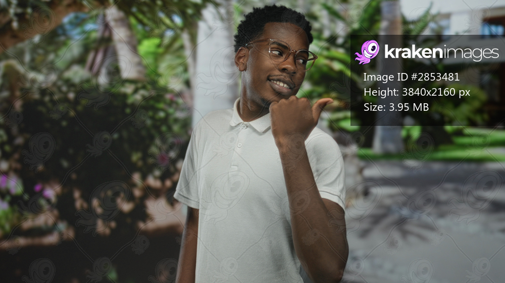 Young man wearing white polo shirt points finger at building entrance amid green foliage; confidence assurance strength.