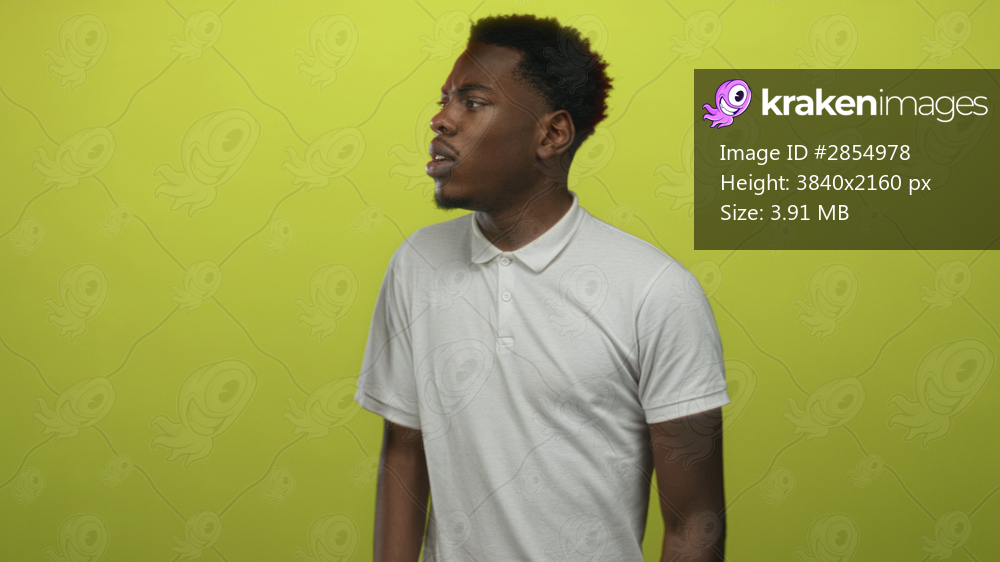 Young man wearing white polo shirt with raised hand gesture and profile gaze in green studio; confusion doubt introspection uncertainty.