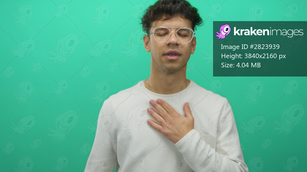 Young man wearing white shirt and clear eyeglasses clutch chest for heartattack in green studio with tense expression; panic.