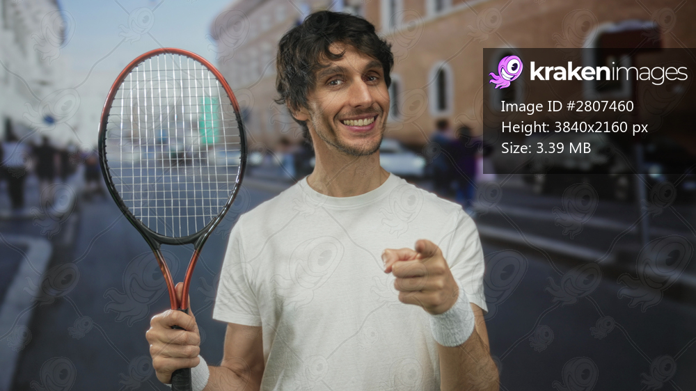 Young man wearing white shirt holds red tennis racket and points finger in street; confidence challenge.