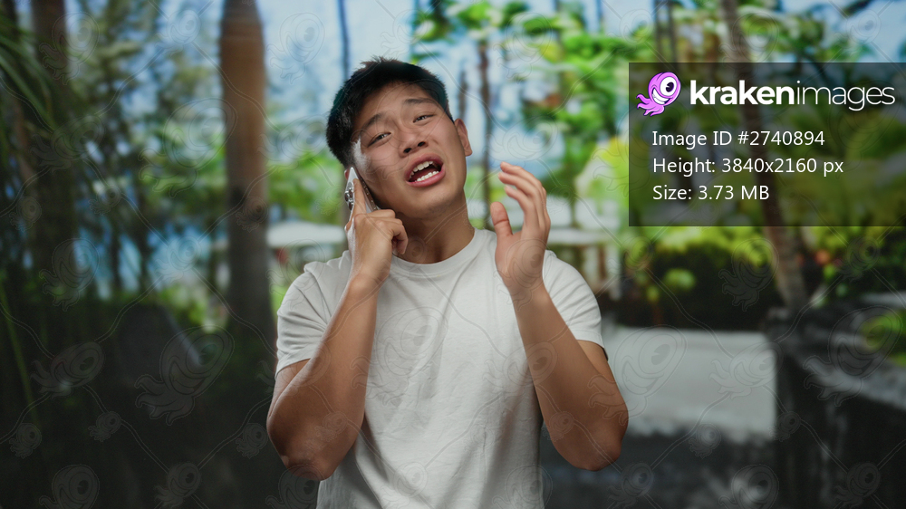 Young man wearing white shirt using smartphone in sunny park setting with lush green trees, displaying an engaging conversation.