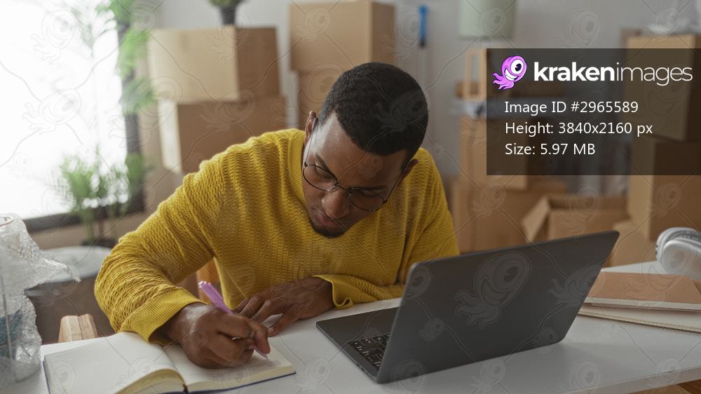 Young man wearing yellow sweater and glasses writing in notebook with laptop at table amid moving boxes in studio; focus planning.