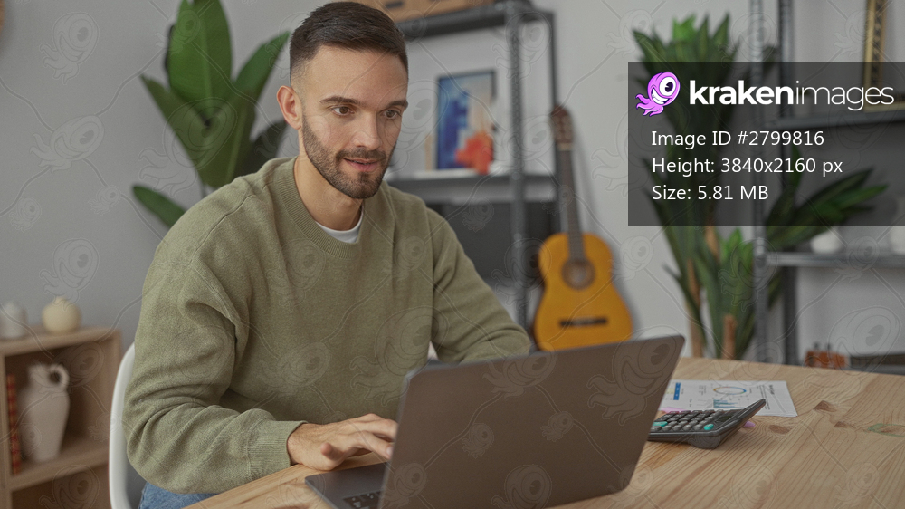 Young man working from home on a laptop in a cozy living room featuring plants and a guitar, focusing on a financial spreadsheet with a calculator nearby on the wooden table. - Kraken Images