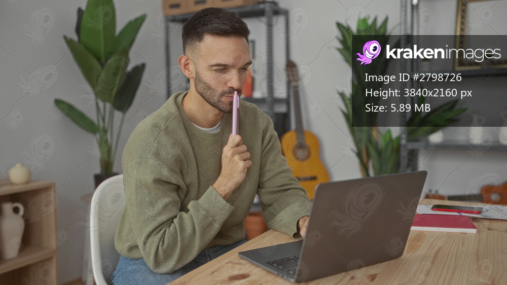 Young man working on laptop in cozy living room with plants and guitar creating a modern home office atmosphere.