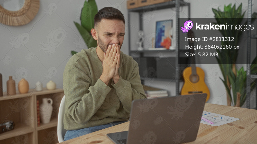 Young man worried in living room uses laptop with papers on table and guitar in background reflecting stress indoors at home