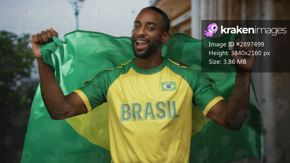 Young man wrapped in brazil flag smiling with arms raised holding the flag and wearing a brasil jersey on a city street; joy pride support.