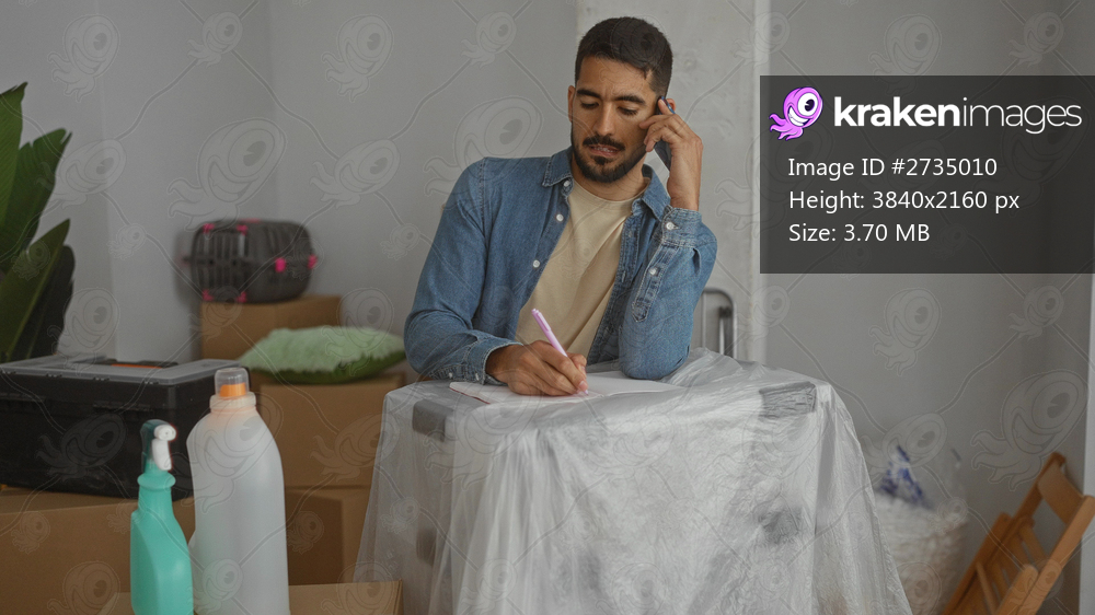 Young man writing and talking on phone in new home surrounded by boxes and cleaning supplies in living room of modern apartment